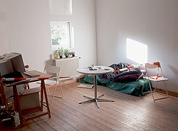 Schlafplatz VII/2002/1.0 Liege, grünes Laken, Computer und Monitore (Zuspieler für die Animation Glaube, Liebe Hoffnung für Mitte), Basilikum und Thymian, Tische und Stühle. Hier ist das einzige nicht verschlossene Fenster des Ausstellungsraumes. |