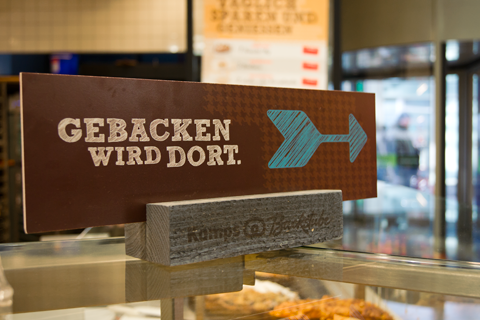 In einer Filiale einer Back-Shop-Kette werden Teiglinge in einem Ofen aufgebacken, auf den ein am Computer erstellter Pfeil weist, der so tut, als sei er von Hand gezeichnet worden.
