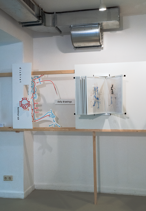 Nun habe ich auch den letzten Bereich, der seit der Ausstellungseröffnung von mir noch nicht weiter bearbeitet wurde, in Angriff genommen und die Verkleidung des als Raumteilers fungierenden Regals verändert: die Versieglung hat zugenommen und wurde nicht nur mit Styroporteilen bestückt, sondern diese auch gleich an die Zeichnung daneben angebunden. Außerdem entstand auch gleich noch ein Fenster, dass mir nicht nur weitere Möglichkeiten der Staffelung eröffnet, sondern mir auch von meinem Arbeitsplatz einen Blick auf die Besucher ermöglicht, die beim Blättern durch die Flasher ein ganz spezifisches Geräusch verursachen und mich so auf sie aufmerksam machen... |