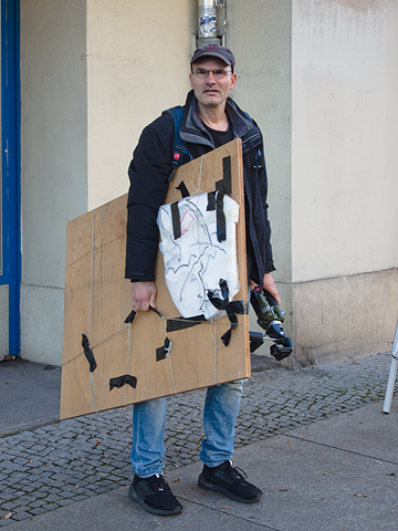 Nie leer gehen... Am Tag zuvor, am Sonntag, war ich mit zwei Tischböcken und einer Knicklampe zu einem Treffen des Frauennetzwerks Saloon in der Galerie Nord gefahren, heute hatte ich eine Tischplatte, die ersten neuen bezeichneten Styroporteile* und mein Stativ dabei, um meinen Arbeitsplatz für die nächsten Wochen in der Ausstellung einzurichten und dann meine Arbeit (wieder) aufnehmen und dokumentieren zu können.** Der Tischplatte hatte ich einen Tragegriff gebastelt, um sie so irgendwie mit S- und U-Bahn transportiert zu bekommen. |