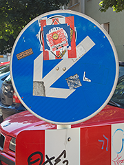 Lieblingspfeil Nr. 1692 Pfeil mit sich überlagernden Parasiten In meiner Nachbarschaft tobt der Stickerkampf: Sticker von Union werden schnell mit Stickern von Hertha überklebt und andersrum... Dabei wird vermutlich wenig auf eine genaue Platzierung geachtet, denn wahrscheinlich ist hier nicht gemeint, dass man sich, angezeigt mit dem Pfeil nach links unten, den aktuell oben klebenden FC Union zurück in die 2. Liga wünscht. Der FC Union, ein Fußballverein aus dem Berliner Vorort Köpenick, ist jetzt endlich in die 1. Liga aufgestiegen und einige der Fans des Vereins pflegen eine aufwendige Feindschaft mit den Fans des anderen Berliner 1. Liga Fußballvereins Hertha BSC... Angeblich startete die Feindschaft wegen eines einzigen "Stasi-Hertha"-Spruchbands im Union-Block während eines Freundschaftsspiels [!] im Jahr 1991, also kurz nach dem Mauerfall, weil bei Hertha BSC Bernd Stange, der ehemalige Trainer der DDR-Nationalmannschaft, angeheuert hatte, dem später auch so richtig nachgewiesen werden konnte, Inoffizieller Mitarbeiter der Staatssicherheit gewesen zu sein. Seit dem grölen Hertha-Fans gerne "Scheiß-Union!" statt des offiziellen "Eisern-Union!"; die Union-Fans variieren im Gegenzug die olle Hertha-Hymne von Frank Zander zu: "Nur zu Hertha geh’n wir nicht!"* (Statt "Nur nach Hause geh'n wir nicht!"... Was ich als Hookline immer seltsam fand schließlich geht es doch darum gemeinsam ein Team anzufeuern. Aber vielleicht ist von den grundsätzlich skeptischen Berlinern nicht mehr Support zu erwarten: Seid froh, dass wir im Stadion hocken bleiben und nicht nach Hause geh'n, wenn ihr Scheiße spielt. Allerdings: "Hart sind die Zeiten und hart ist das Team / Darum siegen wir mit Eisern Union" gesungen von Nina Hagen ist auch nicht viel besser... ) |