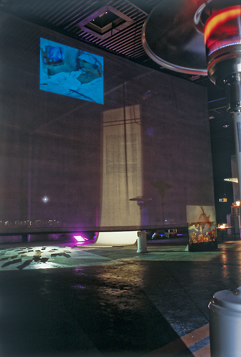 | Der Eingang zur Halle (ganz links der Lichtspalt), 2 Heizpilze, ein großer Prospekt (hängende Leinwand) mit der Projektion des Videofilms von Bjørn Melhus, ein Heizpilz, der Prospekt (die Leinwand) von Hannes Kater von hinten (die einzigste mit Boden und (fast) Deckenkontakt mit einer gewissen "Brückenfunktion"... und eine Projektion (Dia) von Reiner Matysik (v.l.n.r.) | |||||