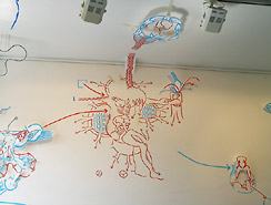 an den Wänden eine Auswahl von gerahmten "Tageszeichnungen" aus dem Zeichnungslog, dahinter dann die Raumzeichnung "Am Gängelband der Affekte".