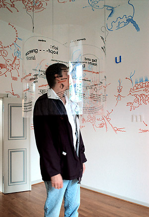 Into a World in a Day Projekt Nr. 21, 2001 Detail der Wandzeichnung (im Vordergrund Besucher im Zylinder) Dokumentation der Wand rechts im Bild unten. |